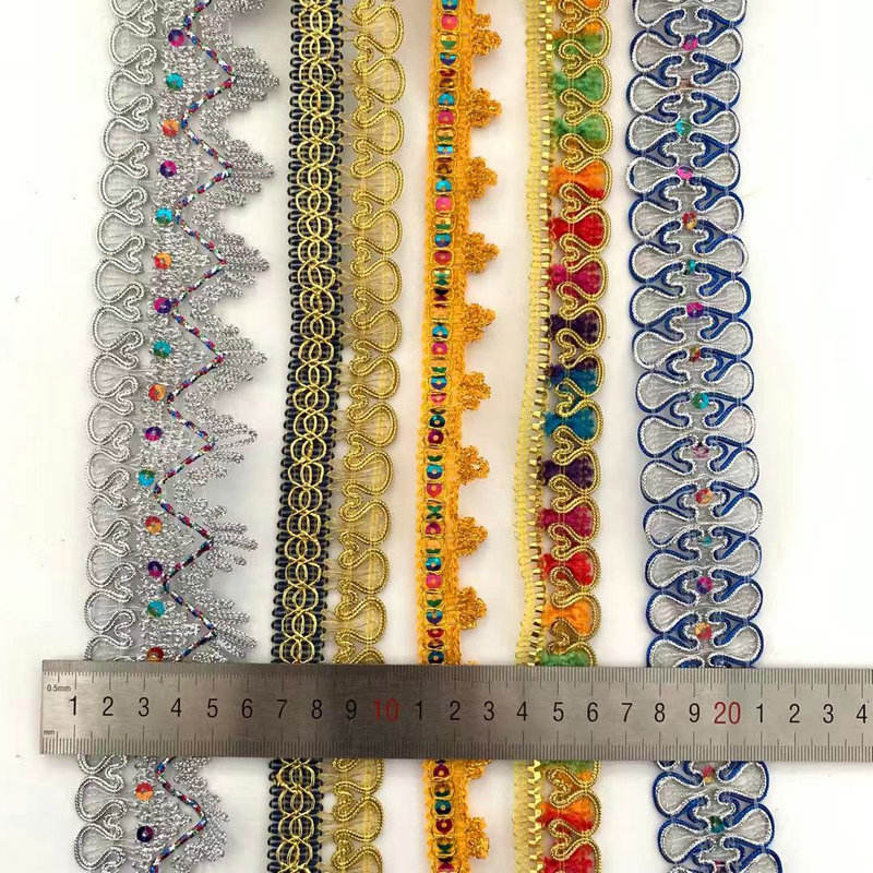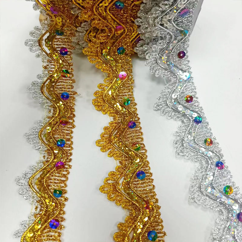 Tøj tilbehør Guld og sølvmetallisk grænse blonder trim flerfarvet paljetter guldtråd Metallisk blonder trim dekoreret med guld- og sølvbicolored metaltråde og syvfarvede paljetter, det skaber en storslået og blændende kantningseffekt. Det er velegnet til dekoration af manchetter, kraver og hems af avancerede tøj såsom aftenkjoler, scenekostumer og brudekjoler. Materialet er let og fleksibelt, falder ikke eller piller og understøtter brugerdefineret bredde og mønstre, hvilket tilføjer en luksuriøs glans til tøjet.