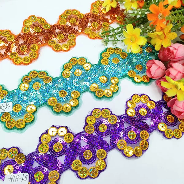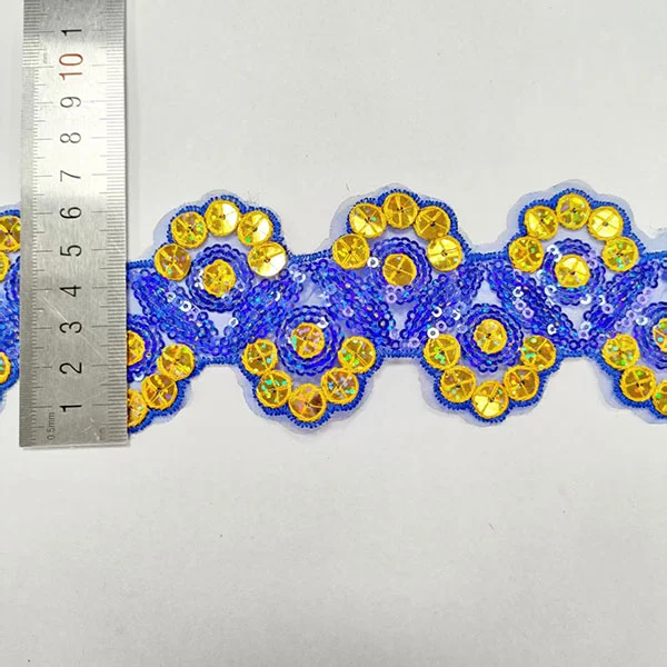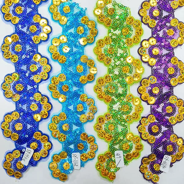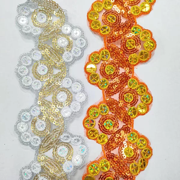 Broderi multicolor paljetter Mesh blonder trimning er en dekorativ type blondertrim, der har kompliceret broderi, farverige paljetter og en mesh -base. Denne type trimning bruges ofte i modedesign og -kørsel for at tilføje et strejf af gnist og glamour til tøj, tilbehør og boligindretning.