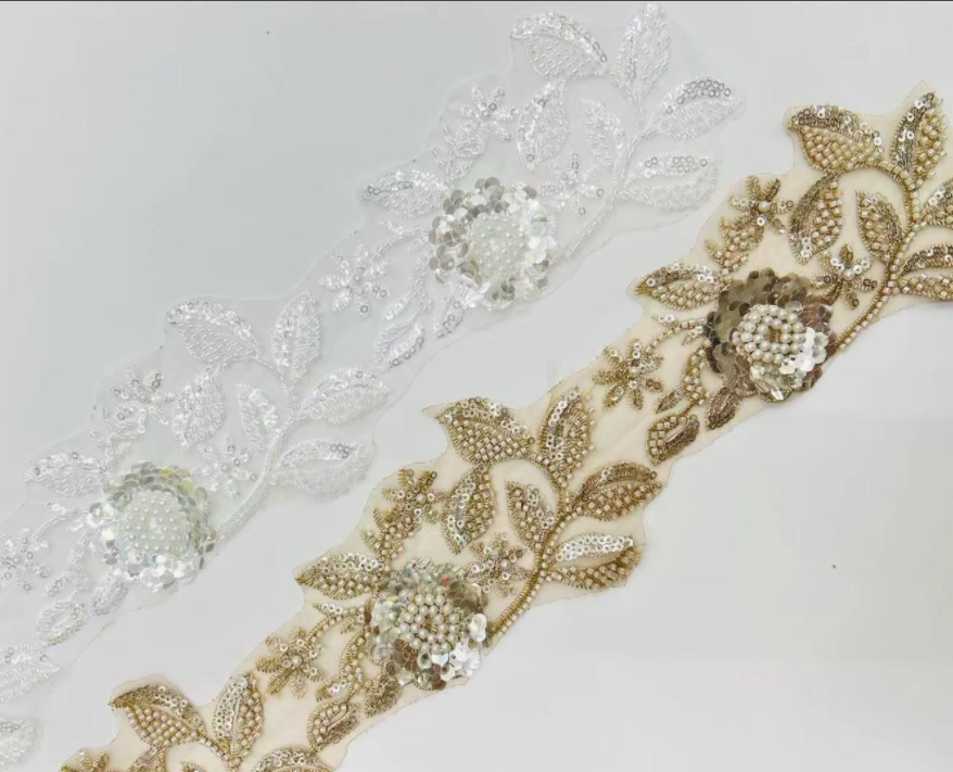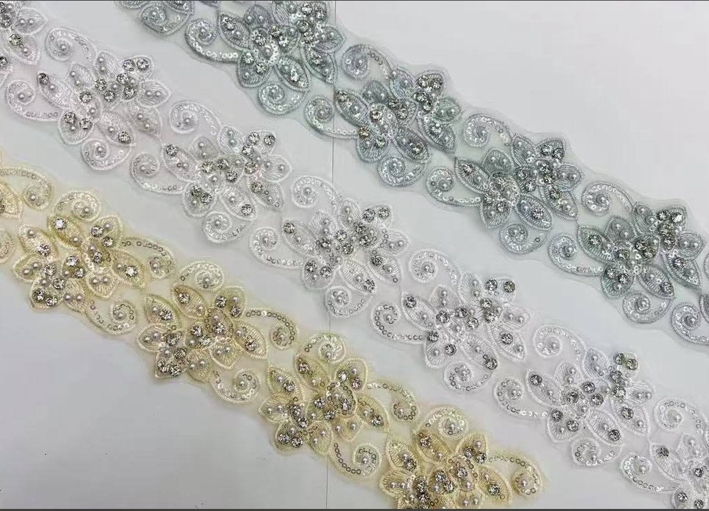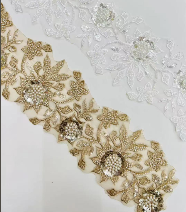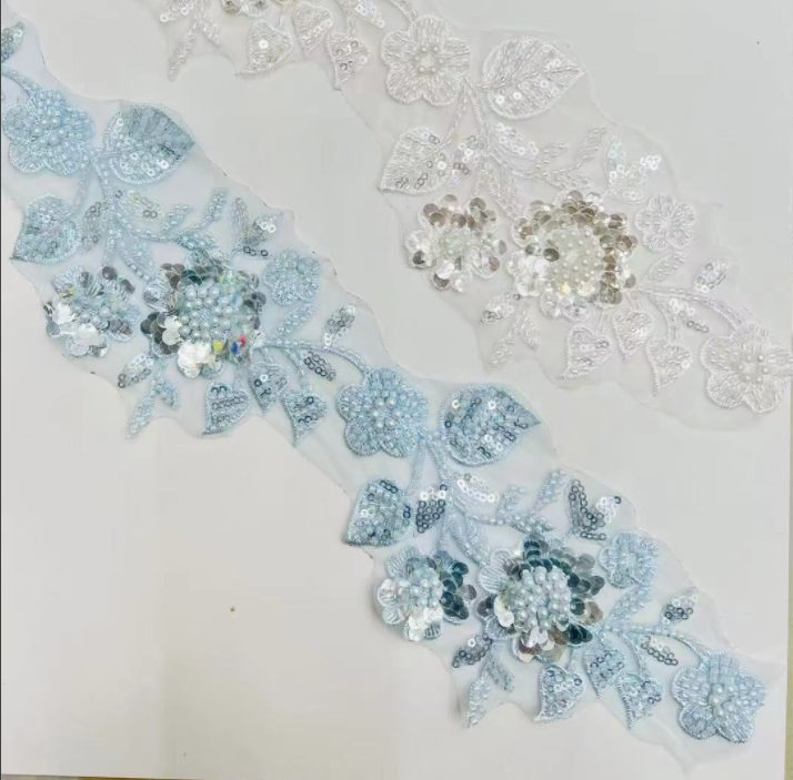 Ny ankomst dekorativt tøj, der syr smuk flettet paljetteret perleperler, blonder, den vedtager et kombinationsdesign af tredimensionel rebvævning, skinnende paljetter og skinnende perler, med rige lag og et delikat touch. Det er velegnet til avancerede dekorationer såsom haute couture aftenkjoler, brudekjoler, aftenposer og hovedbeklædning, hvilket let forbedrer storslåetheden af individuelle genstande.