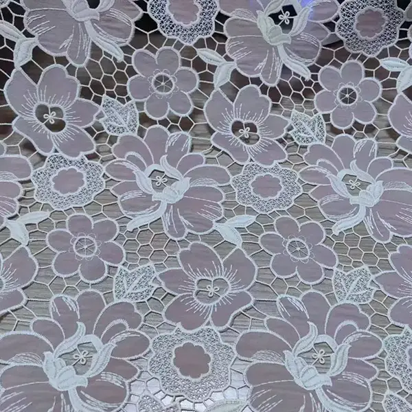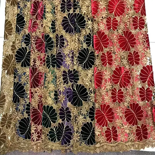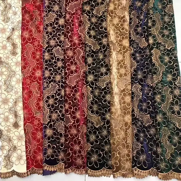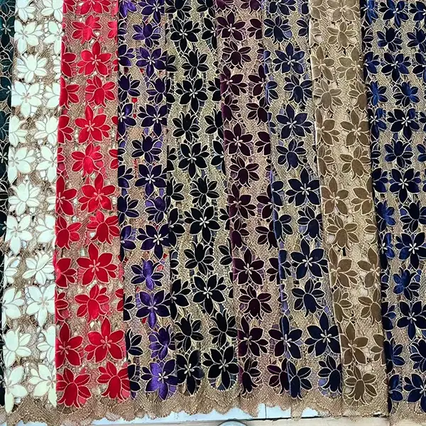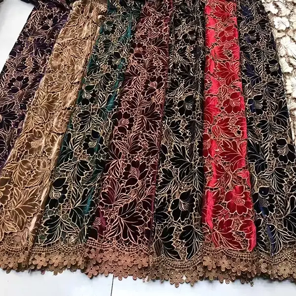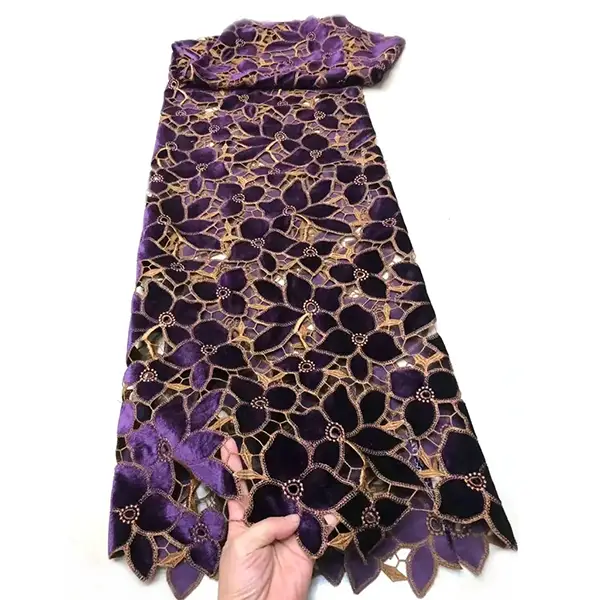 Velvet laserskåret blomstermønster blonder stof med indviklede laserskårne blomsterblonder mønstre, der kombinerer blød struktur med præcisionsdetaljerede designs. Ideel til elegant mode (kjoler, jakker, brudesøj) og indretning (gardiner, puder).