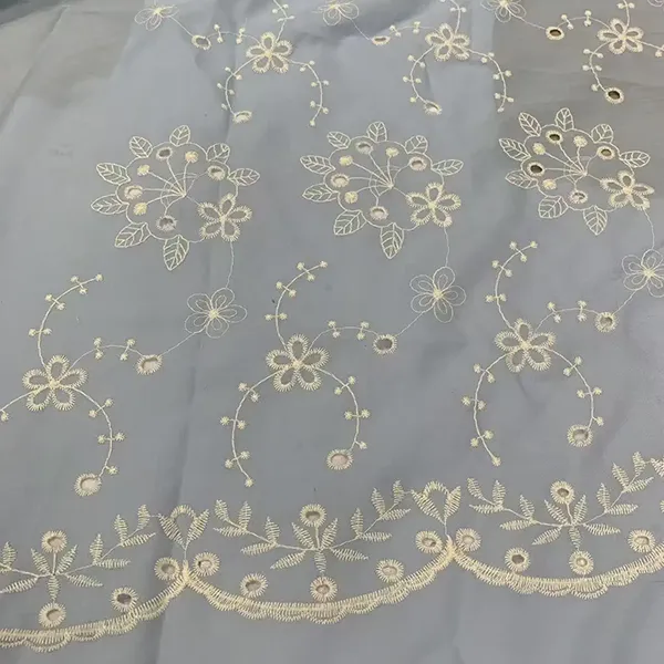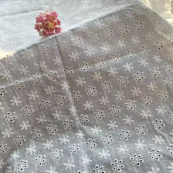 Hvid bomulds blonder broderi eyelet stof til kjole dette elegante blonder stof har delikat broderi og øjenskæringsarbejde, hvilket skaber et åndbart, letvægtsmateriale perfekt til kjoler, bluser og brudeklædning. De komplicerede blomstermønstre og skalterede kanter tilføjer en romantisk, vintage charme, mens den naturlige bomuld sikrer blødhed og komfort.